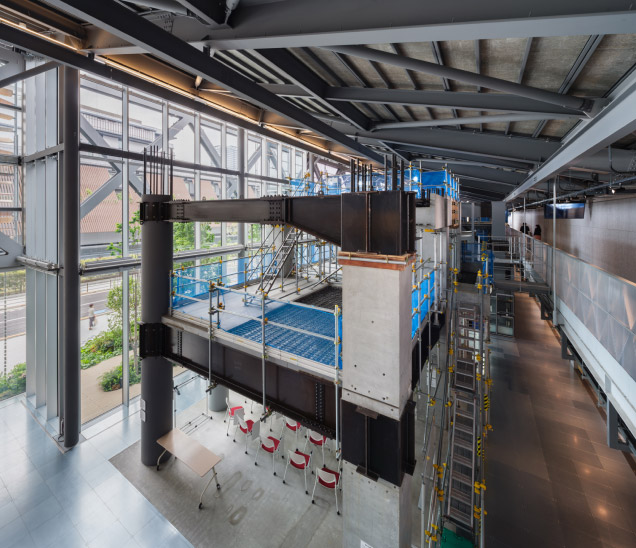 この施設の大きな特徴は、建設現場の実物大モックアップによる実践的な体験型学習がおこなえることにあり、