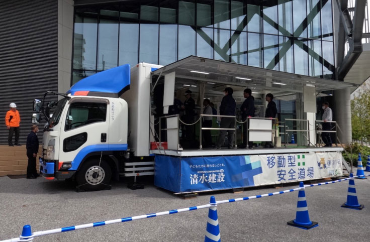 当社施工の移動型安全道場「甕割号」を使った“現場の危険を見て・触って・学べる安全研修”です。